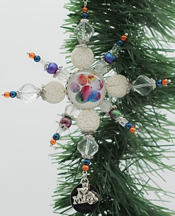 Your Handcrafted Ornament is made of the finest Base Metals, Lava Beads, Czech Bead Glass, Acrylic Beads, Bead Glass with Paw Print Cabochons, "I ♥ My Dog" and "Dogs have paw prints on our hearts" Charms. Size: 5" x 5"